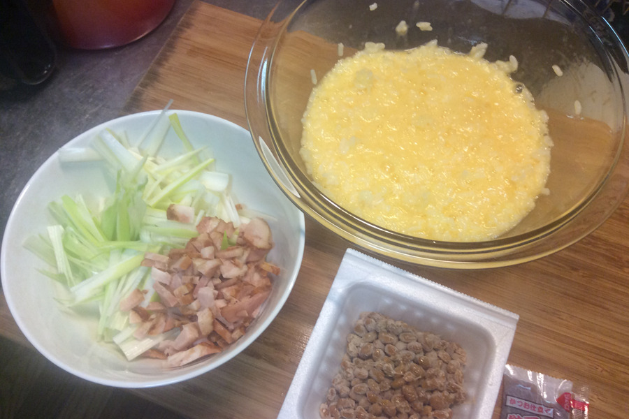 私は、ごはん・卵・チャーシュー・ネギ・醤油でシンプルなチャーハンをよく作ります。 (今回は、納豆チャーハンを作ることにしました。納豆から炒めるだけで、特に作り方は変わりません。) 卵は別に入れるより、あらかじめごはんと混ぜておくとムラなくできるのでオススメです!