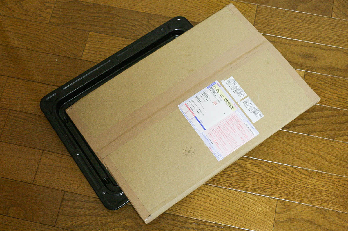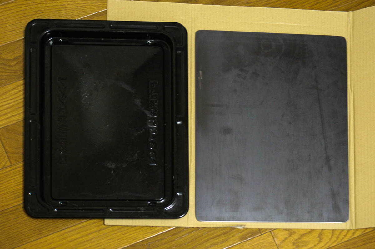 サイズは自分で測って注文します。東芝のER-ND7を使っていますが、388 x 300 でぴったりでした! 四隅と端がしっかりとグラインダーで処理されており、手を傷つける心配はありません。 厚さ2.3mmの鉄板を使用しており重量はなかなかのもの。