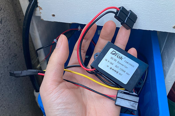 すぐに元に戻せるように、平端子カプラとDC/DCコンバータ、出力側に還流ダイオードをつけて対応完了。電池の電圧が高い際のモーターの騒音防止にもなりました。