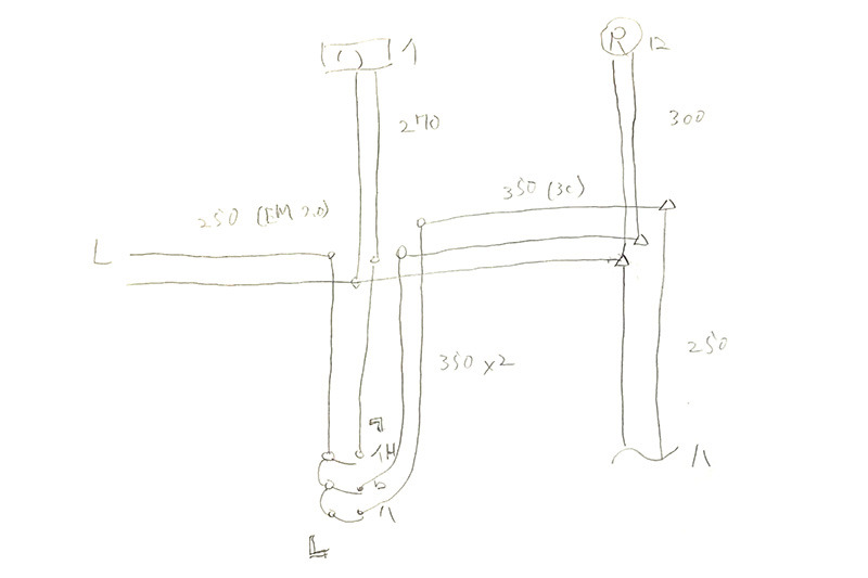 世の中の複線図の書き方を見ると、Neutral側から書く流派が多いようですが、私はLive側から書いていました。色分けや、B/Wを各配線に書いたり、線の切断長以外の数字を書くパターンもありますが、余計な情報が増えるとミスに繋がると思ったため、最低限の要素のみを書き出すことにした結果がこの複線図となります。
