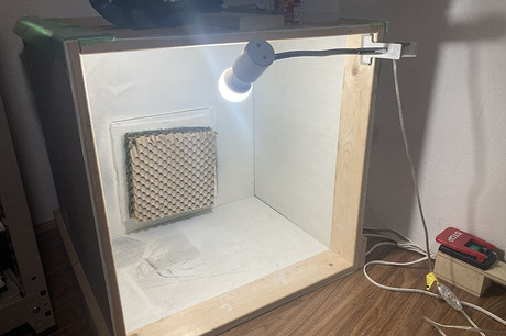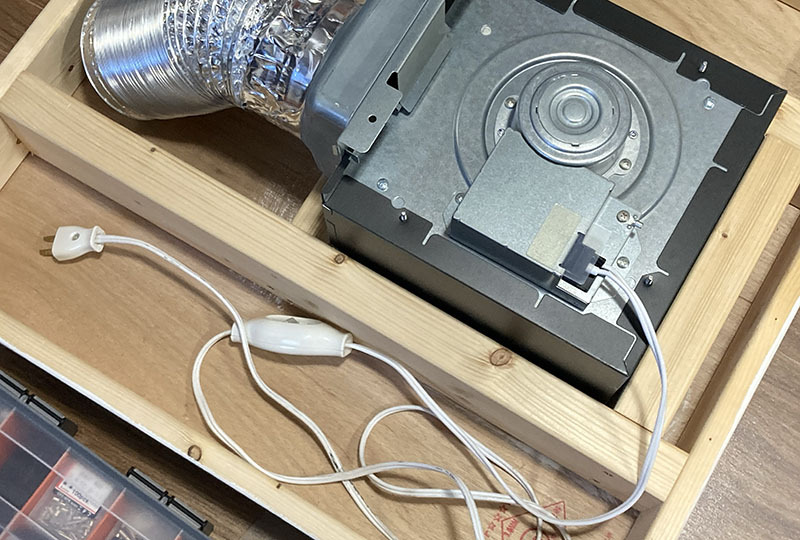Panasonicの天埋換気扇 FY-24BM6Kと1x4材を組み合わせた簡易塗装ブースを作りました。600mm四方のものまでこれでいけます。それ以上のサイズのものはダンボールなどで拡張した上で工作室を養生シートで処理することで対応します。