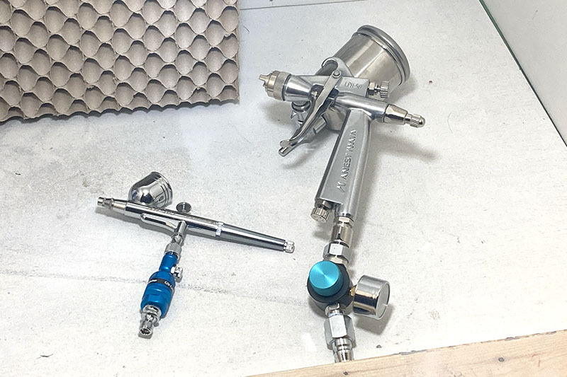 ベタ塗りであれば、小物から大物まで上記スプレーガンで行けますが、 シンナーの使用量を下げたい・本当に少ししか塗装しないということであれば、0.3mm口径のエアブラシも悪くないと思います。ベタ塗り塗装であればトリガーアクションが良さそうではありますが、価格がダブルアクションよりも高いので、私はダブルアクション式のエアブラシ"エアブラシワークス AW-103"を使っています。整備パーツが入手できる点もポイントです。
