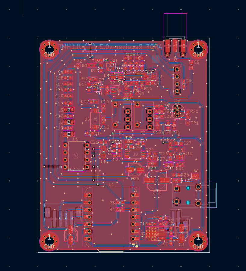 テストした構成で KiCadを使ってプリント基板(PCB)を設計・実装を行いました。 ブレッドボードでは配線の寄生容量などで特性が暴れることもありましたが、プリント基板にしたことにより、指定した周波数の信号をピンポイントで拾うようになりました! ただし、一発目で動いたわけでなく、ひとまず部品を実装して電源を入れたものの動かず、局発から出ている信号のカップリング用キャパシタの追加が必要となり、カッターで基板を削る荒技で対応しました。 何故ブレッドボードで動いていたのかは謎です。