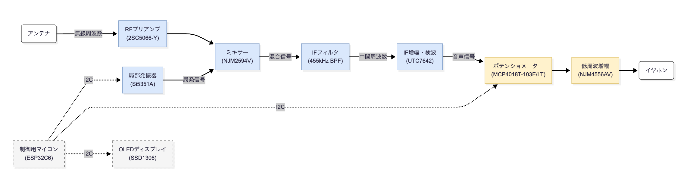 通常、144MHz帯の受信機はダブルスーパーヘテロダインで構成するのが定石のようです。 しかし、回路規模が大きくなると調整箇所が増え失敗のリスクが高まるため、今回は、144MHzから一気に455kHzへ落とすというシングルスーパーヘテロダインで実装することにしました。 (無線技士の試験にも出たスーパーヘテロダインをまさか実装することになるとは……) さらに、検波回路をディスクリートで組むのを避け、AMラジオ用ICに丸投げする構成としました。 簡易型と割り切っているので、近隣で強力なイメージ周波数が出ていないことを祈るスタイルです。